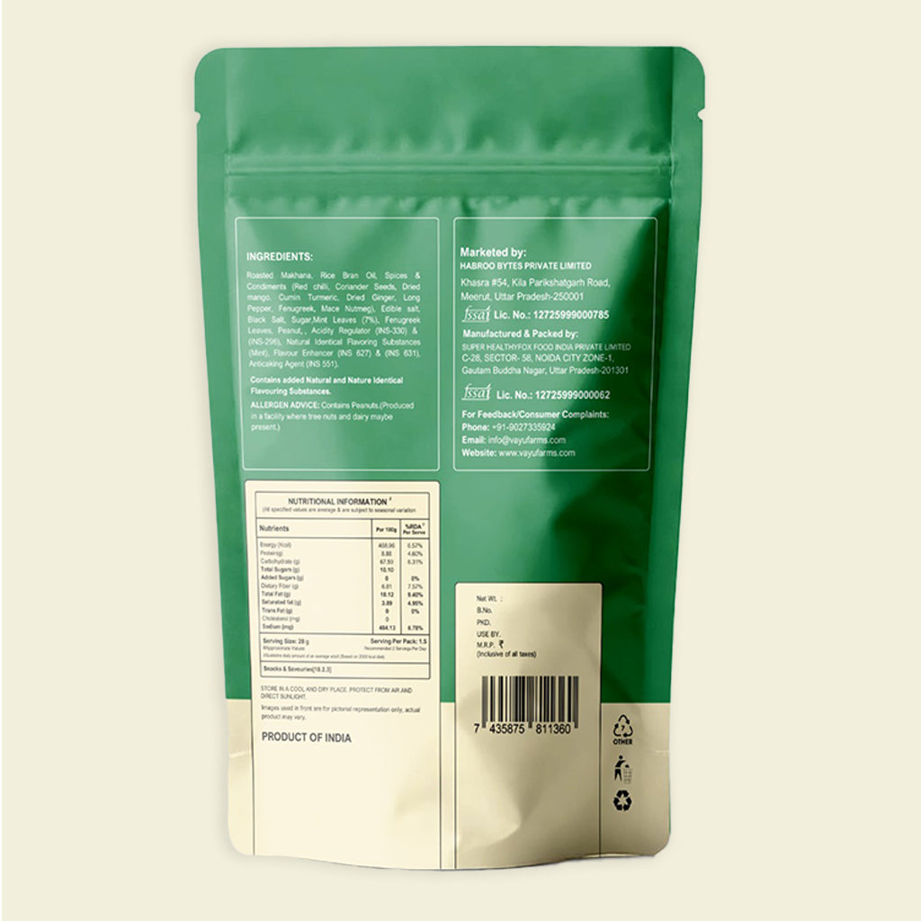 Roasted makhanas, rice bran oil, natural spices and seasonings, mint leaves, salt, sugar, and permitted flavouring substances.